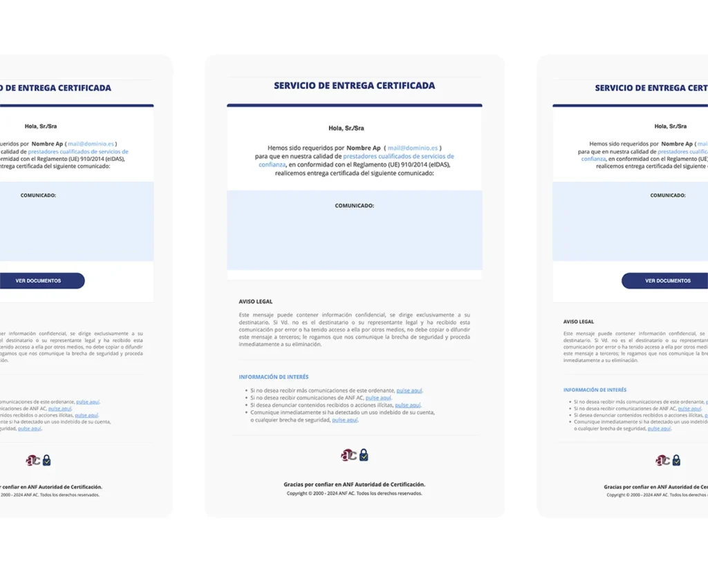 La Entrega Certificada de ANF AC, permite enviar comunicaciones y documentos, mediante SMS y email, recogiendo trazas de auditoria para garantizar así la garantía y eficacia jurídica. Mediante estas comunicaciones, los usuarios podrán asegurar la autenticidad e integridad de los envíos, así como la identidad de emisor y receptor.