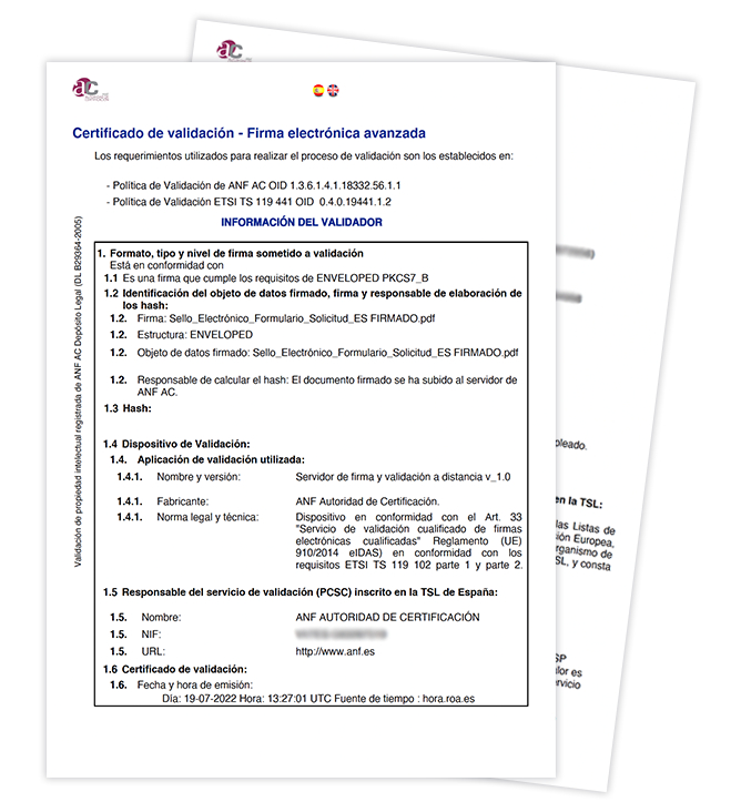 El servicio de validación cualificada de ANF AC, cuyo resultado se recoge en un informe firmado por ANF AC, tiene carácter de prueba “iuris tantum”, de conformidad al art. 326 de la LEC. Este informe, conocido como “Informe de validación certificado” dónde los recogerá el listado de elementos analizados, con su correspondiente resultado y evidencias.